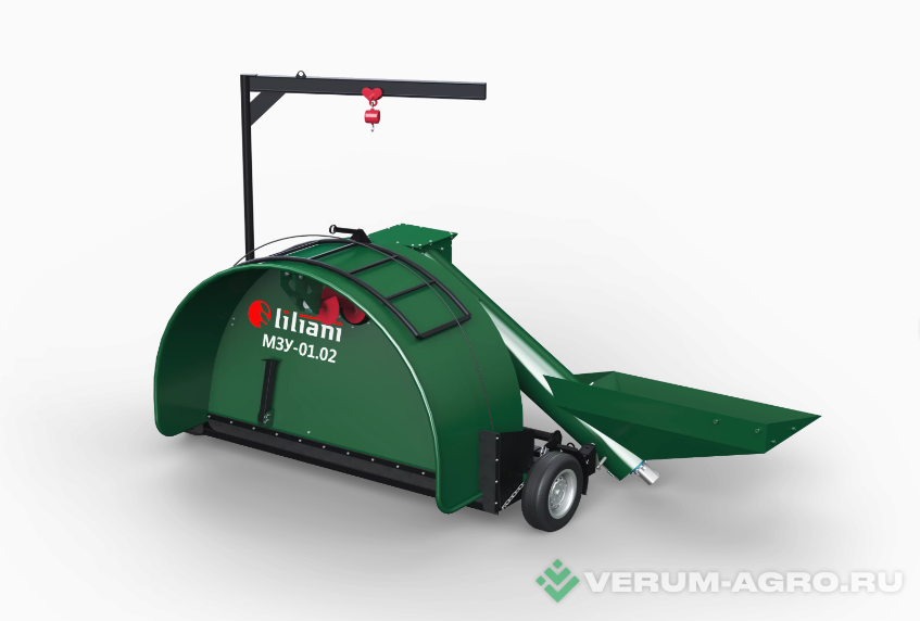 Зерноупаковочная машина МЗУ - 01.02 с нижней загрузкой. Работает от ВОМ и гидравлической системы трактора. Для подачи зерна в данную модель используется автомобиль с задним выгрузным склизом.