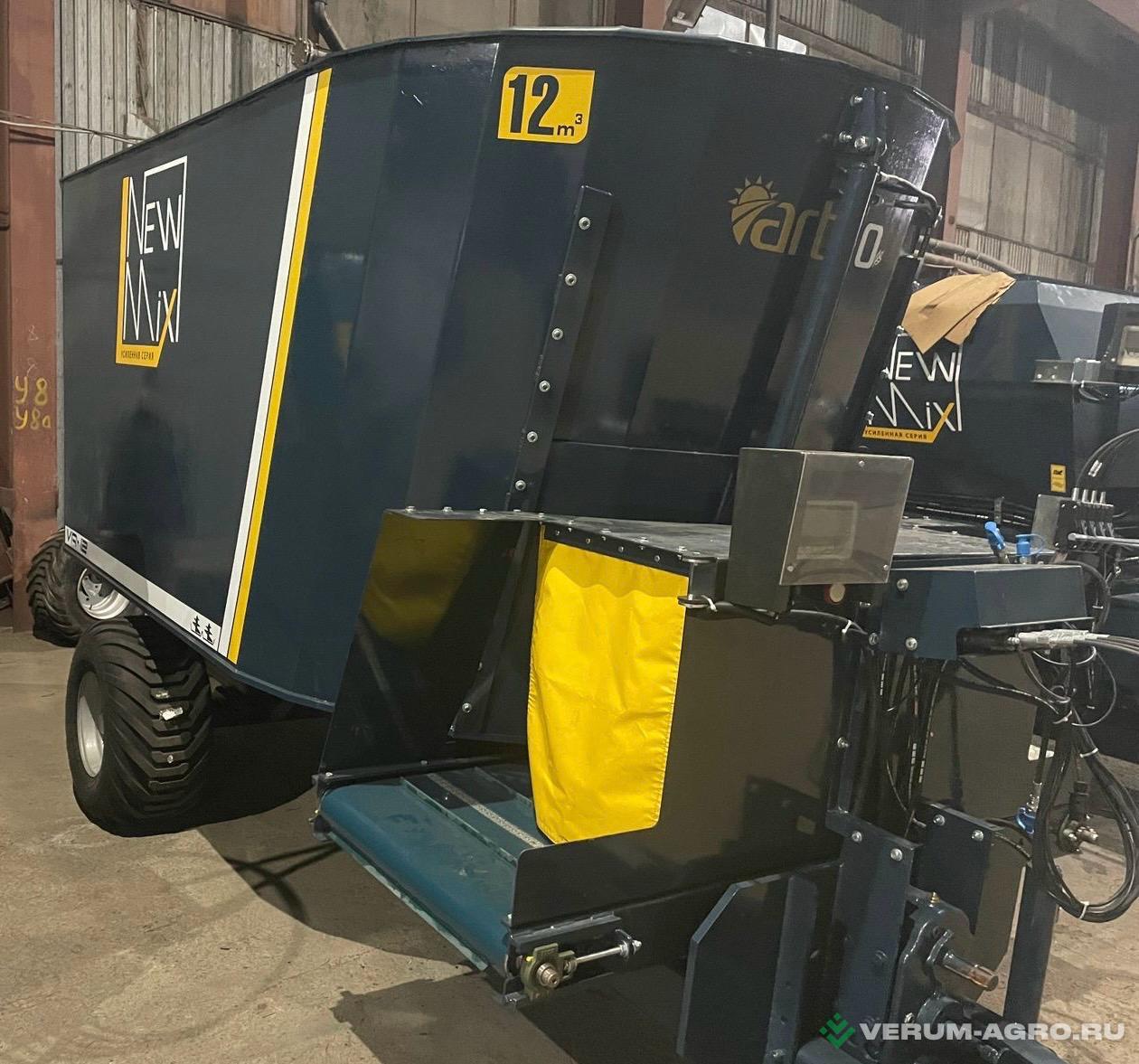 Миксер-кормораздатчик НьюМикс (NewMIX) VR12 с двумя вертикальными шнеками. Комплектация миксера из наличия: фронтальный транспортёр, весоизмерительная система с компьютером, широкоугольный карданный вал, двухскоростной редуктор (два шнека, три редуктора). Магнитоулавливатели на шнеках.