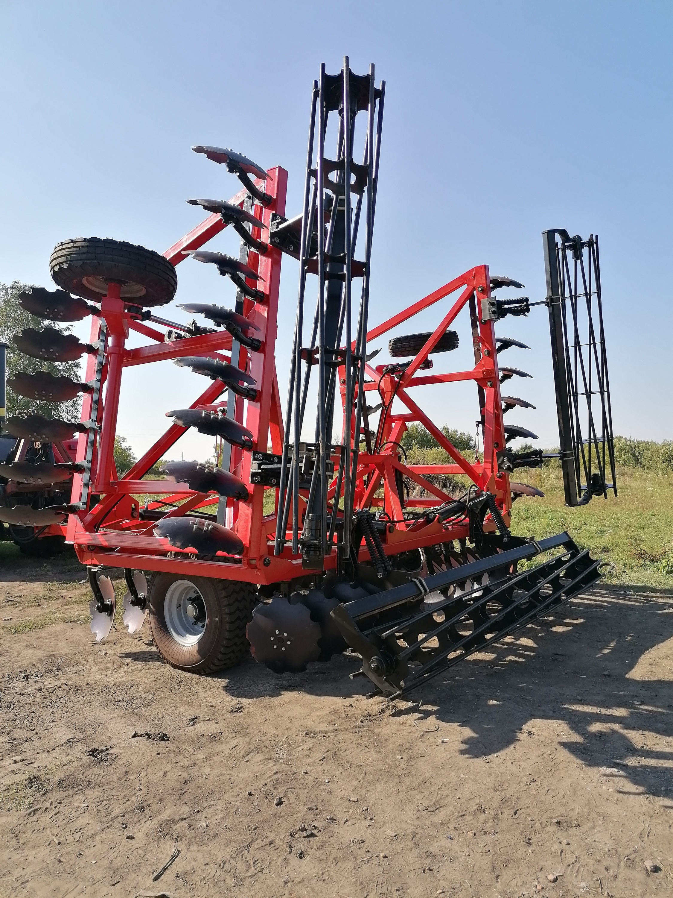 Увеличенное расстояние между рядами (2000 мм) и между дисками (320 мм) исключает забивание соломой и пожнивными остатками, позволяет увеличить скорость обработки поля при высокой засоренности и влажности. Применяется рабочий орган - диск "Ромашка" фирмы Bellota (Испания) на индивидуальной стойке с механически изменяемым углом атаки.