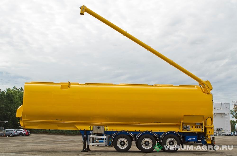 полуприцеп-кормовоз, предназначен для бестарной перевозки сыпучей пищевой продукции (зерновых культур, муки, отрубей, комбикорма, сахара, кормов, гранул и др.). Конструкция цистерны выполнена из алюминиевого сплава (Германия) в виде несущей емкости. Объем цистерны составляет 45,5 м3. Муковоз разделяется на 4 отсека. Транспортируется тягачом колесной формулой – 4х2 российского или иностранного производства. Количество изолированных отсеков – 1 (емкость может быть разделена внутренними перегородками на 5 (пять) герметичных отсека для перевозки различных сортов груза с индивидуальной выгрузкой. Расстояние между осями 1360 мм. Колеса 385/65R22,5; 6+1. Общая масса 34700 кг. Нагрузка ССУ 12300 кг.
