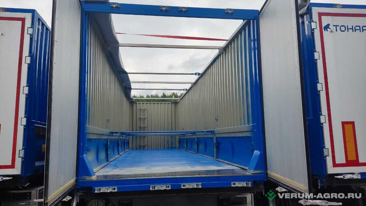 Кузов прямоугольной формы выполнен из профилированного прокатного листа и оснащен защитным тентом с механическим приводом. На каждой стороне кузова расположено по 4 разгрузочных лючка. Разгрузка полуприцепа осуществляется на боковые стороны посредством двух подпольных гидроцилиндров.