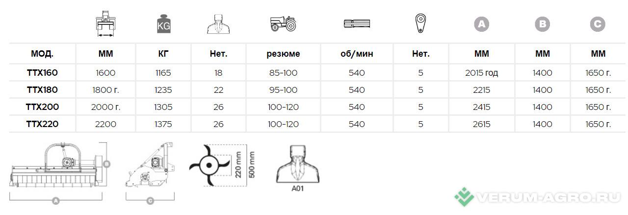 Мульчер (косилка,измельчитель) T-MAX/TTX220.Специальная дробилка для измельчения побегов виноградников, фруктовых деревьев и т.п. до 10 см в диаметре, особенно на каменистой, влажной, песчаной местности и даже на предварительно подрезанных лозах,центрированное сцепление,подвижная защелка для передней и задней версии,группа множителей со свободным ходом,задние колеса закреплены на оси,2 ряда контрмолотов типа коготь на HARDOX,внутренние гребни супер дробилок,разгрузочные задние экраны,двойной гидравлический питатель из износостойкого материала,монолитный корпус (ремни + устройство подачи с правой стороны.),молотковый ротор и сильно усиленные опоры,специальный молоток с большой инерцией,болты и карданный шарнир,средства защиты от несчастных случаев в соответствии с правилами ЕС